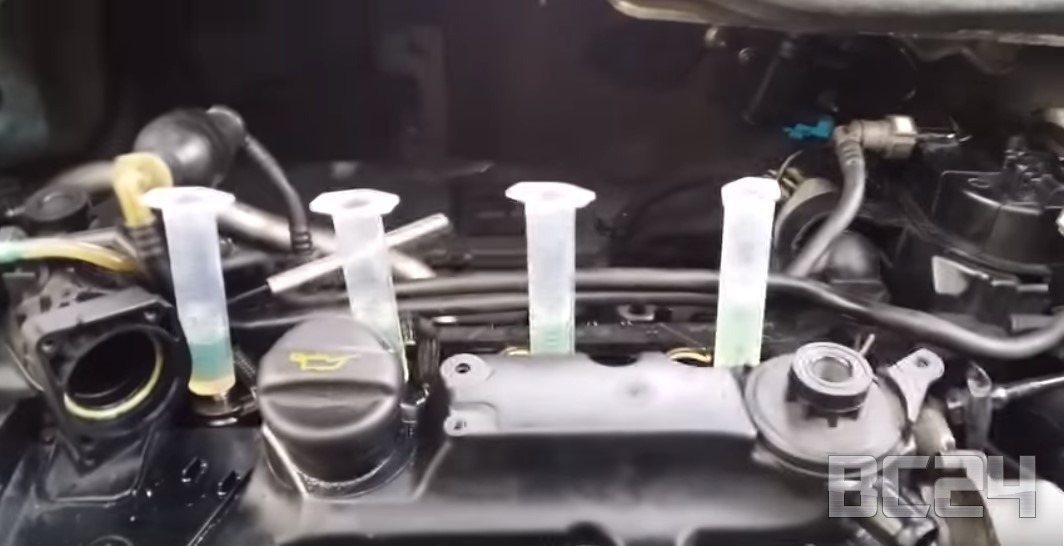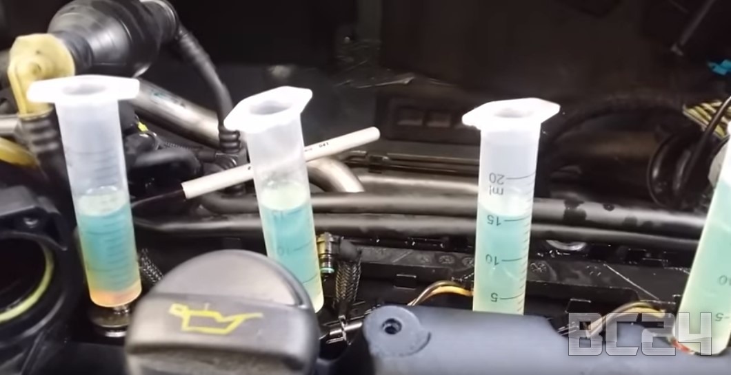 Внимательно следим, чтобы не было утечки. Это очень важно. Вот уже отчетливо видно, что 4-я форсунка сливает больше чем все остальные.