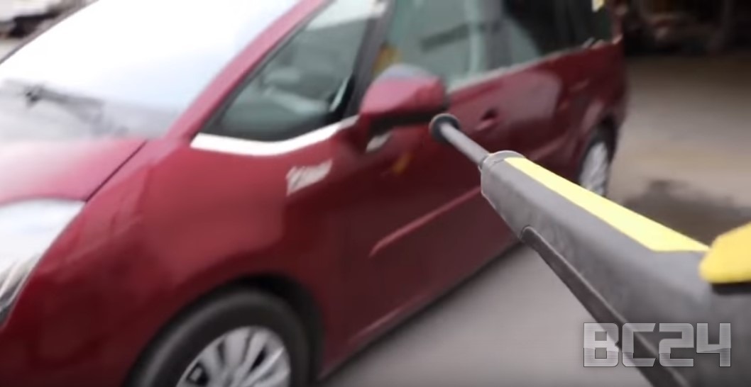Если моете автомобиль на мойке самообслуживания, то обязательно обдайте с керхера щетку, как показано но фото.