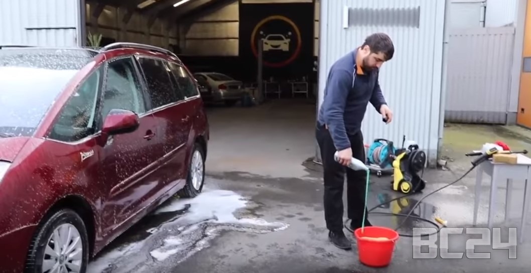 Сначала необходимо сбить грязь и песок с кузова автомобиля, для этого окатываем ее из ведра несколько раз, если есть мини-мойка керхер, то вообще прекрасно.