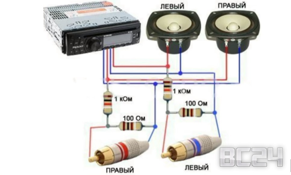 Если на вашей магнитоле нет выхода под усилитель, но есть желание его поставить — воспользуйтесь данной схемой. С ее помощью усилитель будет принимать сигнал сразу с вывода колонок. При этом практически не снизится качество звука.
