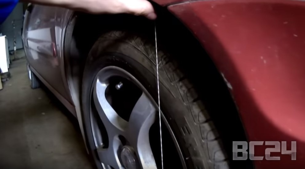 Начнем делать проверку развала колес. Для этого нам понадобится отвес. Желательно чтобы он был плоский и на мягкой нитке.