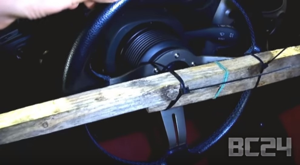 Лучше всего зафиксировать руль получится с помощью рейки, которая прикручивается к рулю и упирается с двух сторон в двери, как на фото.