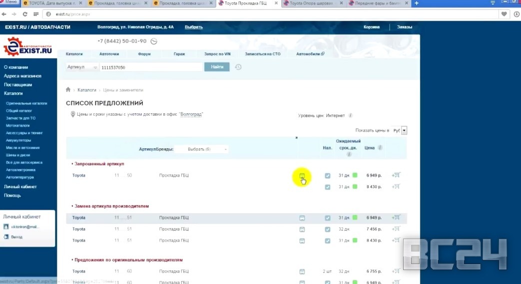 Преимущество онлайн каталогов в том, что мы выбираем туже деталь что и в каталоге на компьютере, и уже видим ее цену. Вот все та же прокладка головки цилиндра.