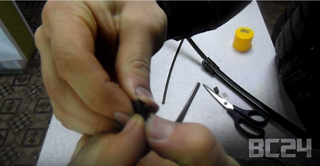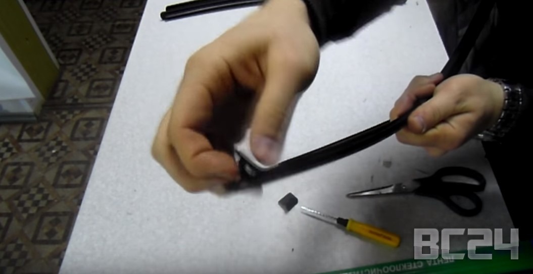 Таким же образом только наоборот, мы заправляем новую резинку в щетку стеклоочистителя, начиная не с первой а со второй, как показано на фото ниже.