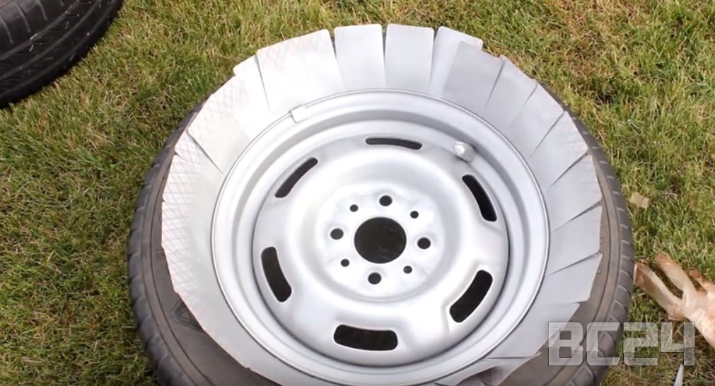 Воспользуемся картами, но не для того чтобы поиграть, а для защиты самой резины от попадания краски. Вставим карты по контуру диска. Теперь когда мы будем красить диск, краска не будет попадать никуда, кроме как на поверхность диска.