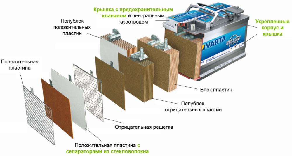 Автомобильные батареи типа VRLA-battarey представляют собой клапанно-регулирующиеся свинцово-кислотные АКБ, в основе которых лежит технология AGM. AGM аккумулятор — это устройство, положительные пластины которого выполнены из сплава PbCaSn, а отрицательные пластины — из элемента PbCa. Следует отметить, что данный тип АКБ является единственным в своем роде, который в принципе не нуждается в обслуживании.